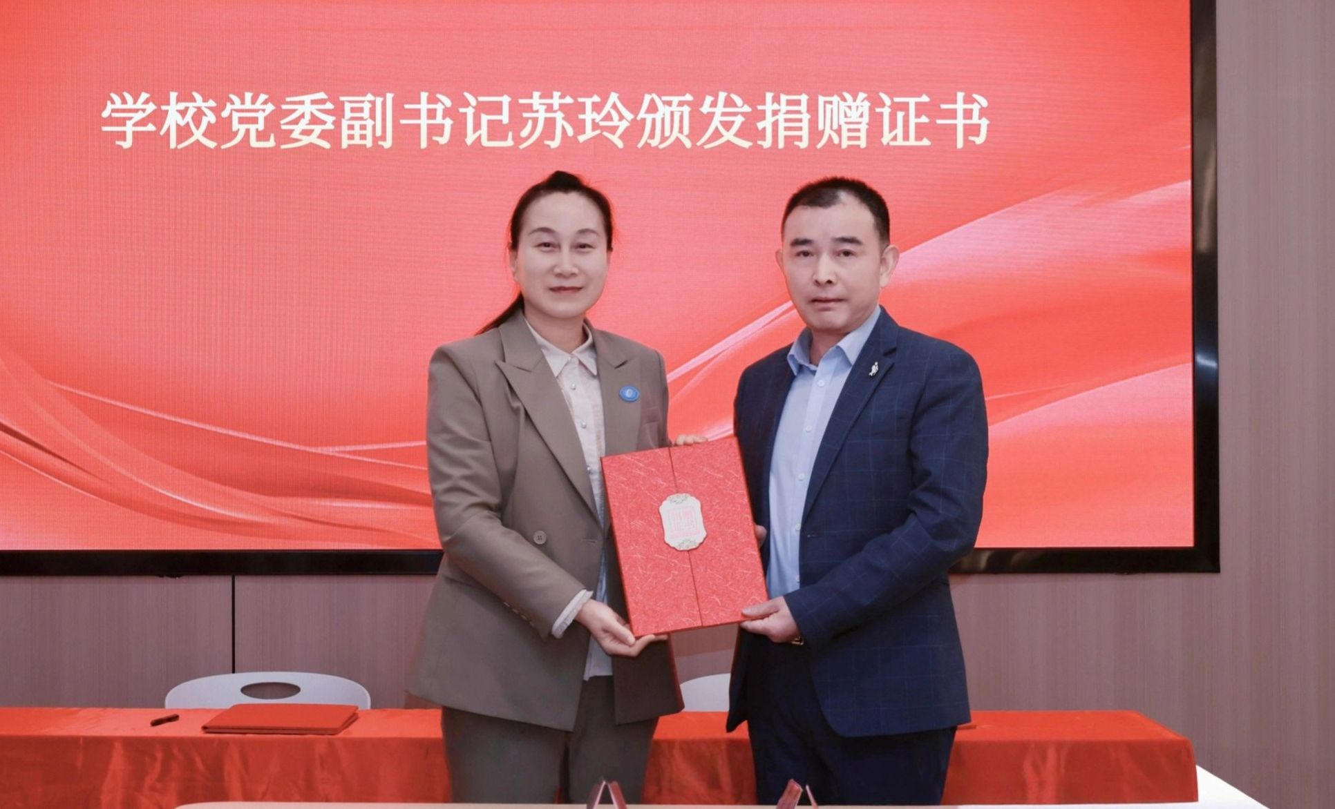 苏玲(左)为孙公民(右)颁发捐赠证书