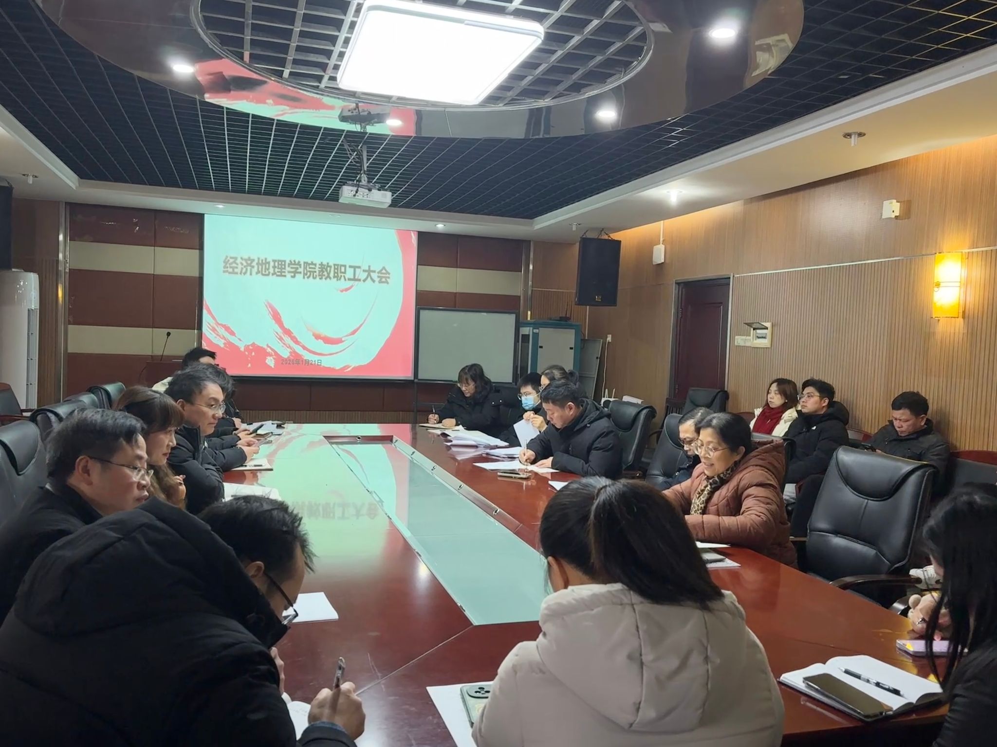 (本网讯)1月21日下午,经济地理学院召开期末教职工大会暨寒假工作部署会,全面总结学期工作,传达上级就业会议精神,并对假期及新学期重点任务作出安排。