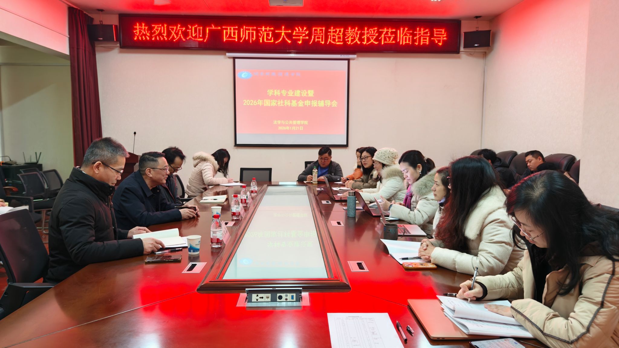 (本网讯)1月21日上午,应我校法学与公共管理学院邀请,广西师范大学政治与公共管理学院院长周超教授来校作“学科专业建设暨2026年国家社科基金项目申报辅导”专题讲座。讲座由法学与公共管理学院党委书记何四海主持,该院全体教师及其他学院相关教师到场聆听。