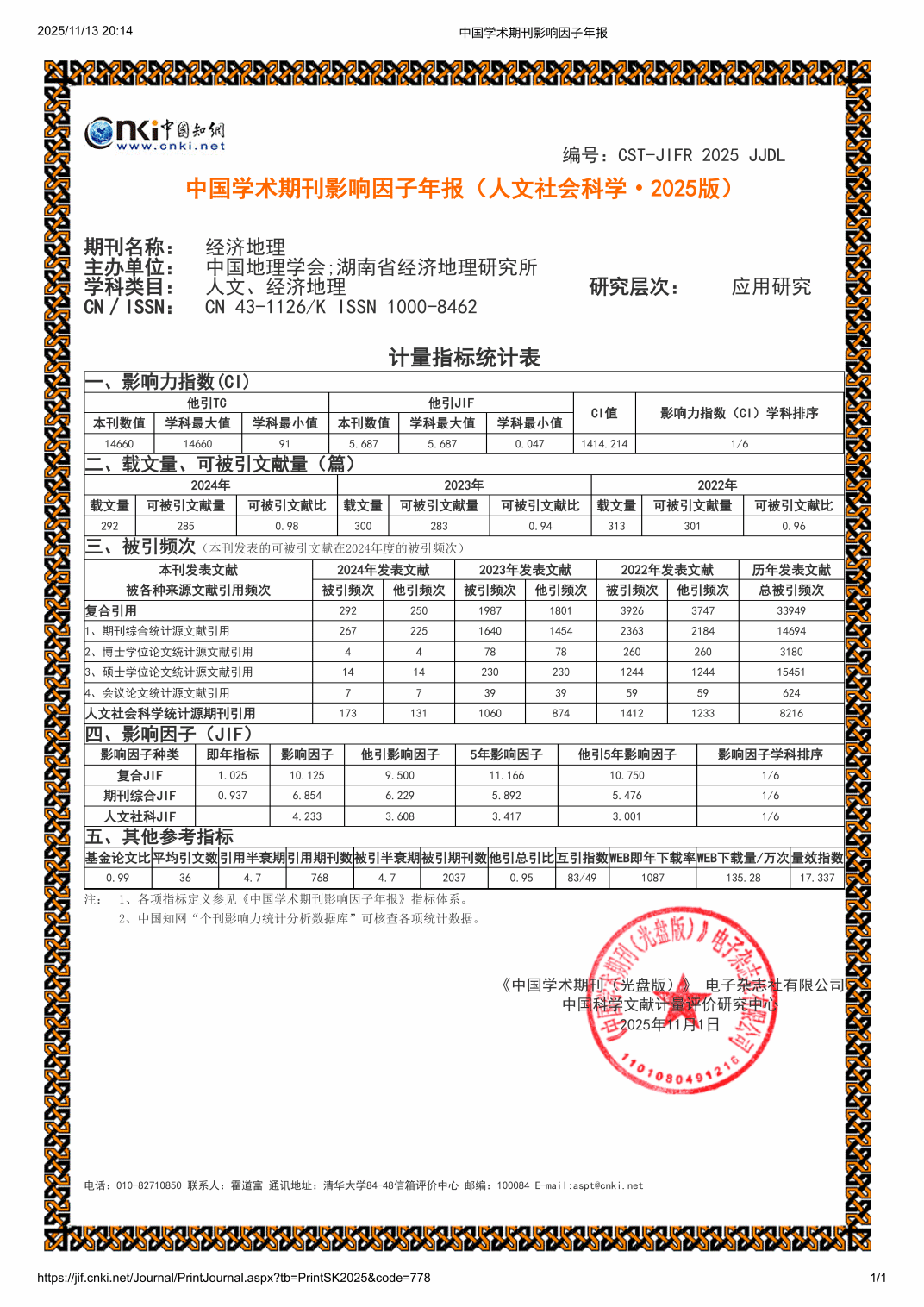 (本网讯)根据日前发布的《中国学术期刊影响因子年报(人文社会科学·2025版)》,《经济地理》期刊复合影响因子突破10.0,达到10.125,综合影响因子提升至6.854,较2024年分别增长14.6%、9.7%,期刊影响力指数(...