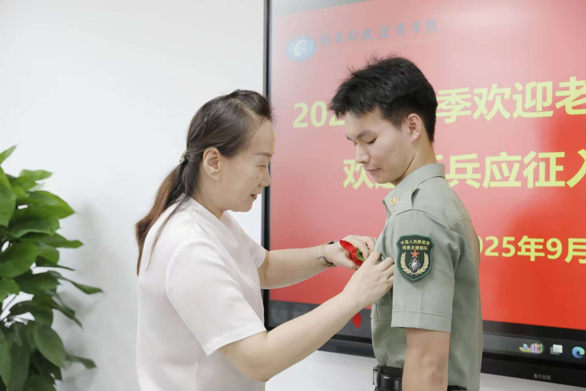 今年秋季,我校共有1名学生退役复学,9名学生应征入伍,其中应届毕业生8人。苏玲为退役复学学生佩戴大红花并赠送纪念品,向到场家长表示衷心感谢,感谢他们为国家、为学校培养出胸怀报国志向的优秀青年。她对同学们提出三点希望:一是赓续先辈基因,厚植家国情怀,让红色基因与湖财精神交融升华;二是铸牢忠诚之魂,践行报国之志,早日成长为“有灵魂、有本事、有血性、有品德”的新时代革命军人;三是传承奋斗精神,勇担时代重任,用汗水和智慧为强军事业贡献湖财力量。