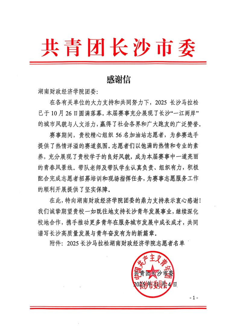 (本网讯)近日,我校团委收到共青团长沙市委员会发来的感谢信,信中对学校在2025长沙马拉松赛事中的志愿服务工作给予高度肯定,并向全体参与服务的师生表示衷心感谢。