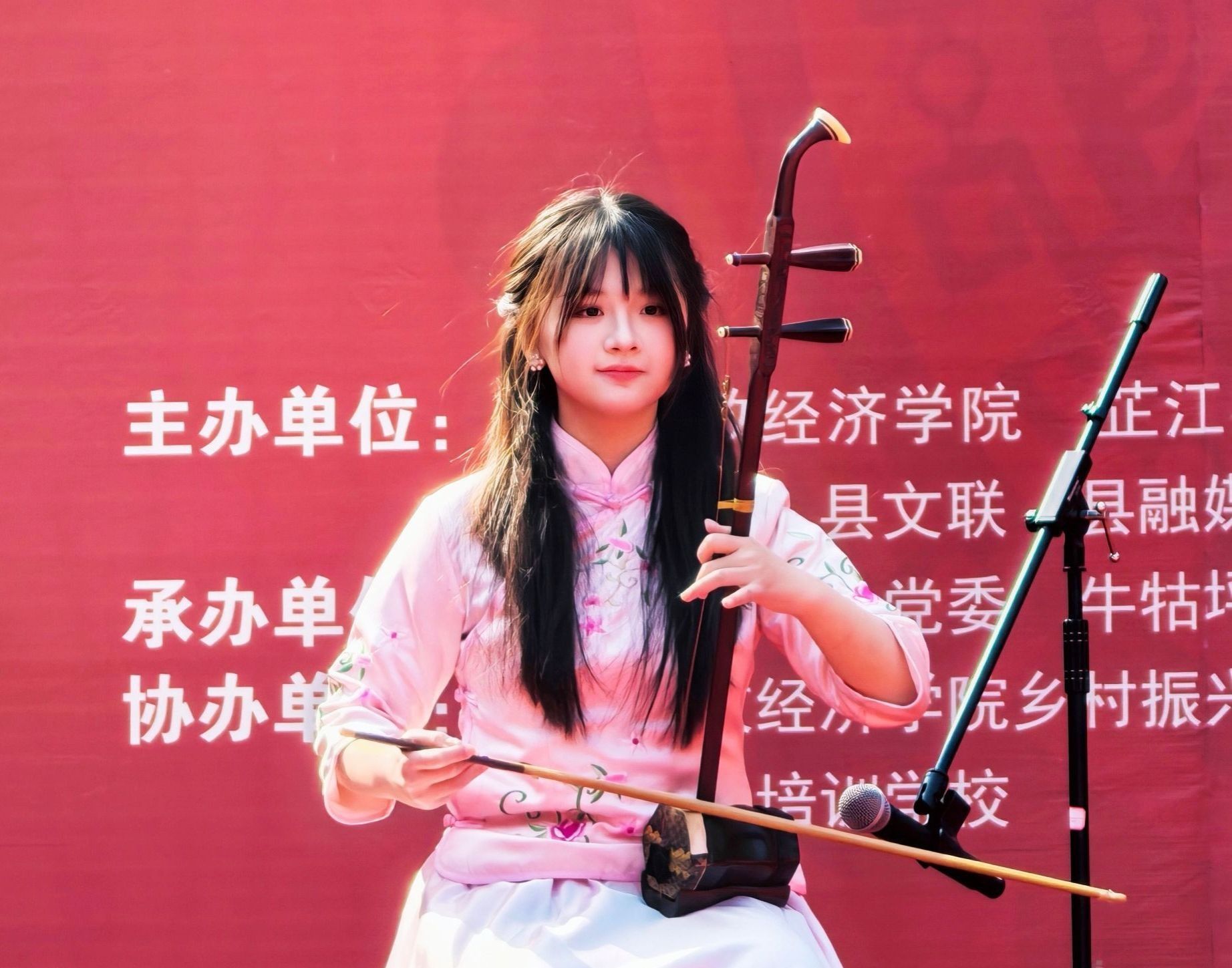 随着音乐响起,备受期待的百姓“村”晚将气氛推向高潮。村民自编自演的侗歌《侗歌向着北京唱》、广场舞《青叶逐兴》、传统“闹年锣”的管弦乐《美丽的鲜花在开放》等轮番登场。我校师生带来的合唱《走在乡间的小路上》和民乐演奏《赛马+步步高》,为山村舞台注入了青春活力。演出间隙的知识抢答、成语接龙等互动环节持续点燃现场热情,活动中还对“新型农民”“好媳妇”“最美公益奉献者”等先进典型进行表彰,让文明乡风在掌声中传递。