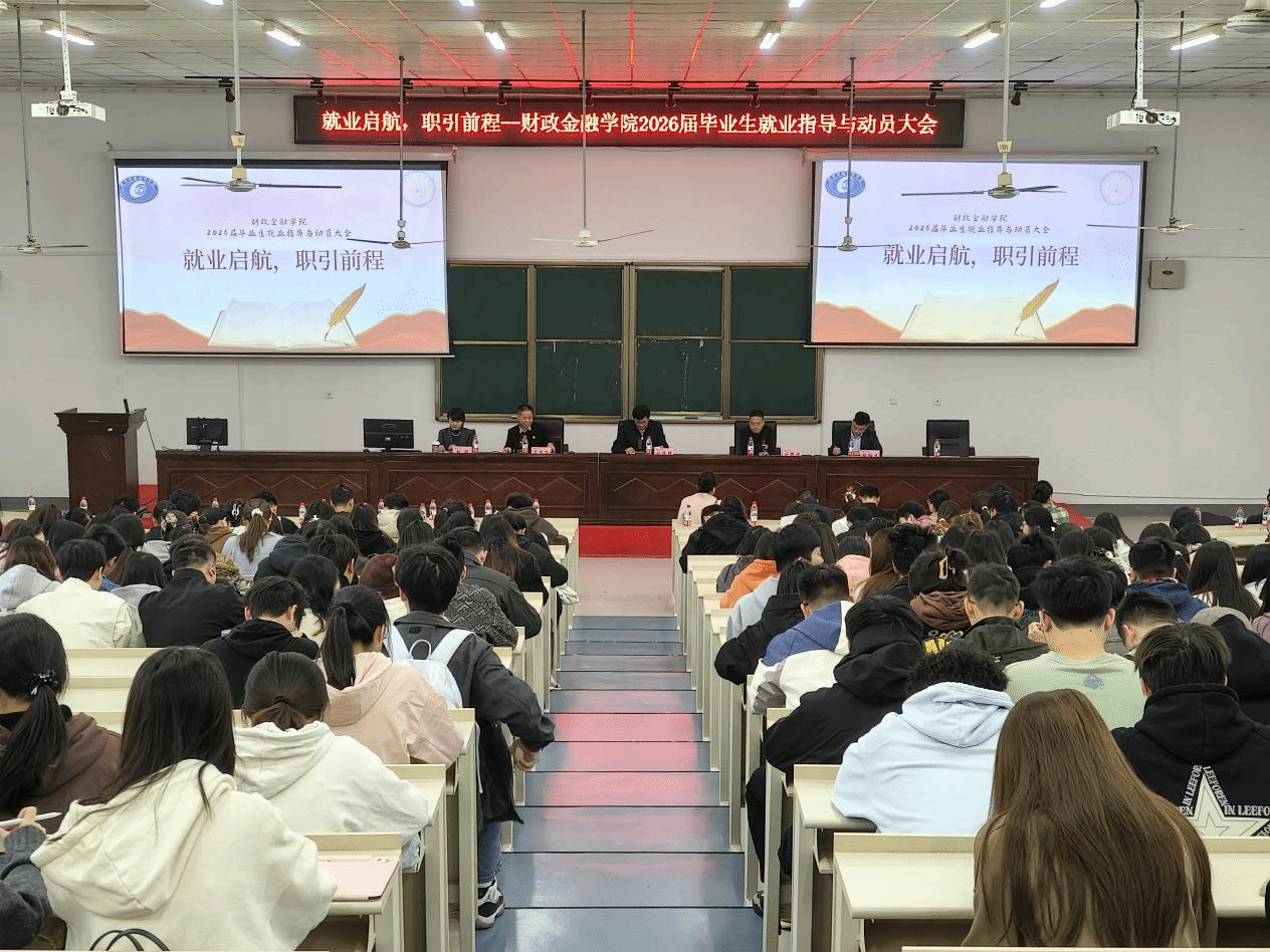 (本网讯)10月23日,财政金融学院在第二教学楼2J01教室召开“就业启航,职引前程”2026届毕业生就业指导与动员大会。学校招生与就业指导中心主任刘振强、中国民生银行湘江新区支行行长张弦、优秀校友代表欧红生到会指导。学院领导、各系主任、全体辅导员及2026届毕业生参加会议。会议由院党委书记肖燕飞主持。