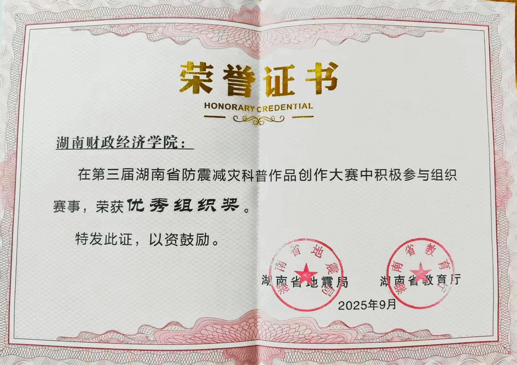 (本网讯)近日,校团委在第三届湖南省防震减灾科普作品创作大赛中荣获优秀组织奖。该奖项由省地震局、省教育厅联合颁发,体现了我校在“以赛促学”方面取得的积极成效。