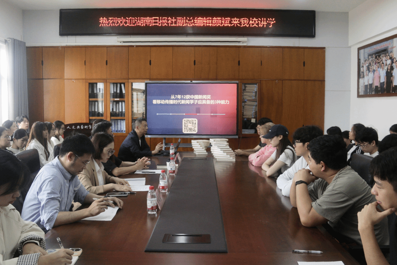 (本网讯)10月15日下午,湖南日报社副总编辑颜斌应邀来校,为人文与艺术学院师生带来题为“从7年12获中国新闻奖看移动传播时代新闻学子应具备的三种能力”的讲座。讲座由学院副院长王美霞主持,院长林铁,网络与新媒体、汉语言文学专业师生以及星辰学生通讯社社员参加。