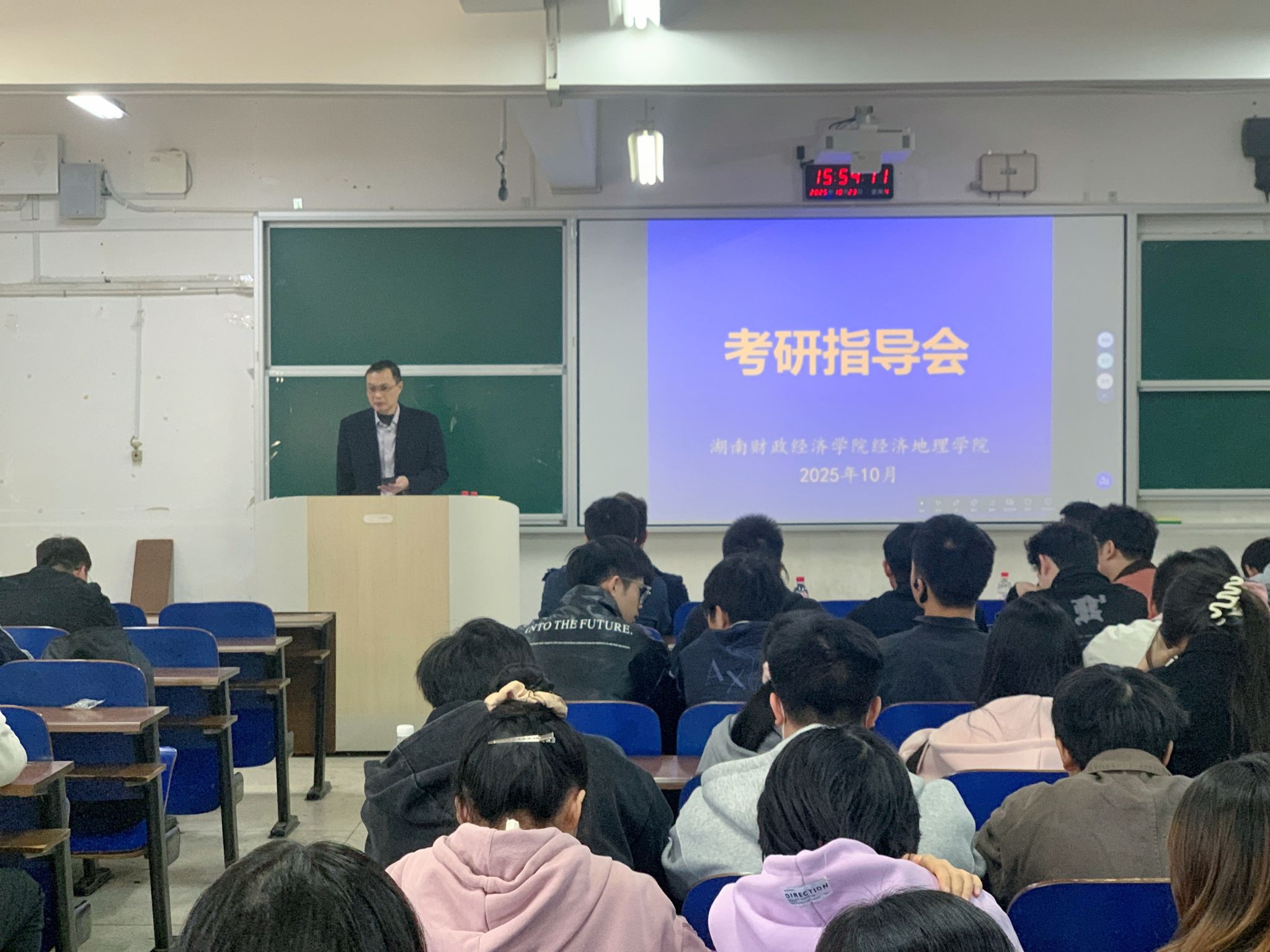 (本网讯)为帮助2026届学子明确考研方向、掌握科学备考方法,10月23日下午,经济地理学院举办2026届毕业生考研指导会。湖南工商大学研究生院副院长吴伟平受邀到会指导。院长彭文斌、院直属党支部书记姚旭辉、副院长苏昌贵、学科办主任、学工办主任、毕业班辅导员以及2022级考研学子参加。