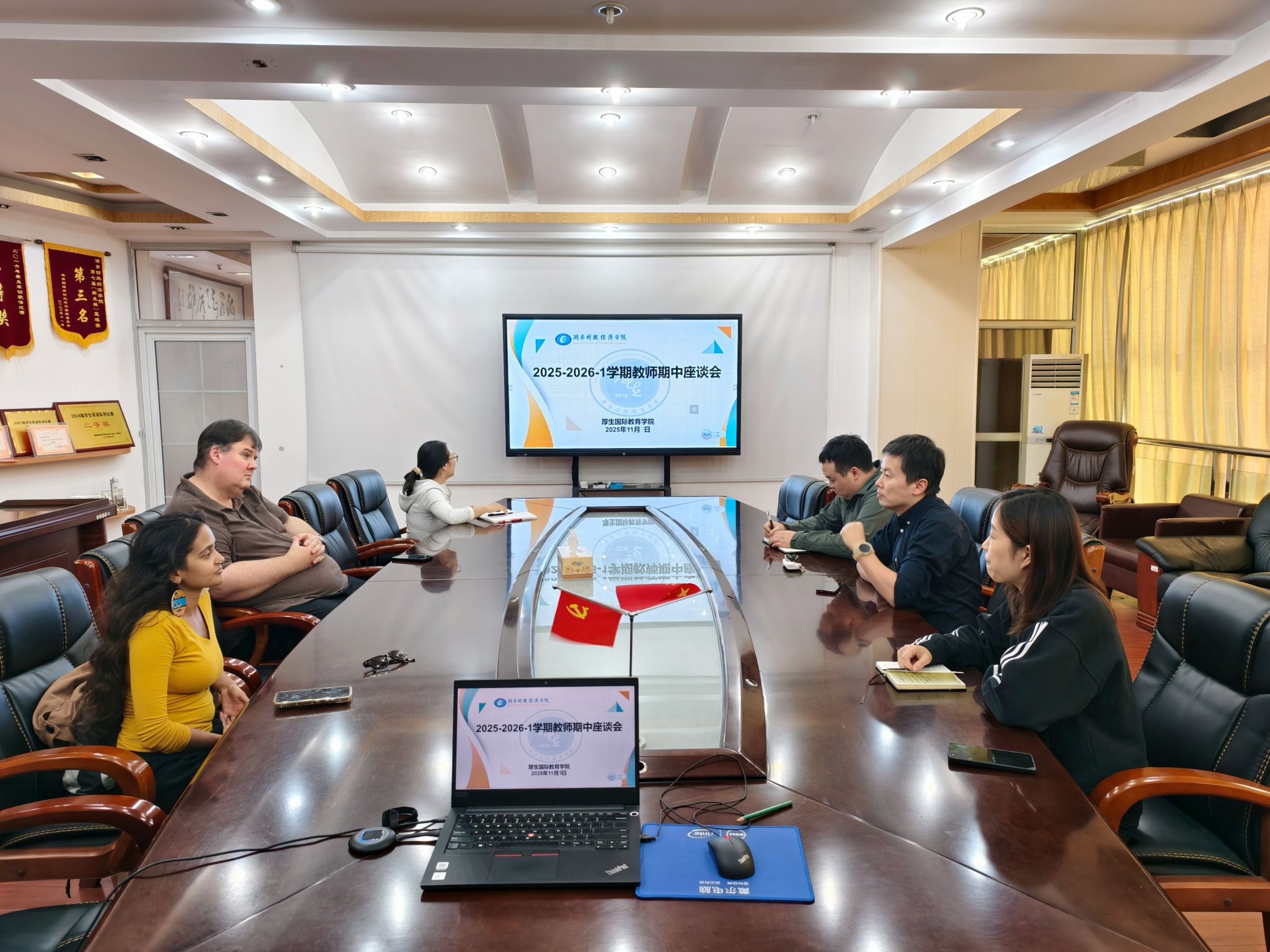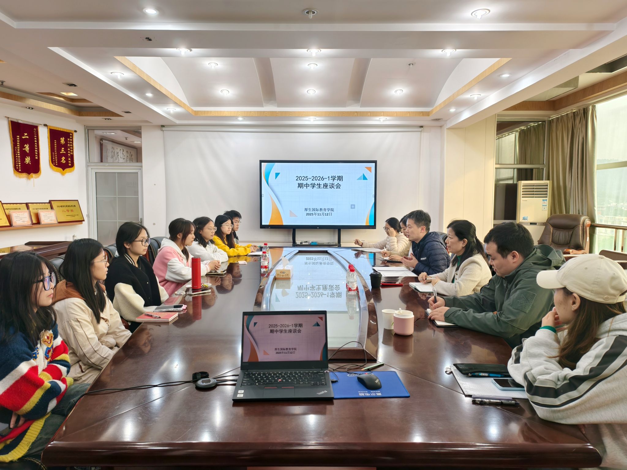 (本网讯)为提升教学质量,促进师生交流,11月12日,厚生国际教育学院在办公楼830会议室召开期中师生座谈会。学院直属党支部书记肖平飞、国际合作与交流处处长傅佳与师生代表齐聚一堂,围绕教学管理与课堂质量展开深入交流。