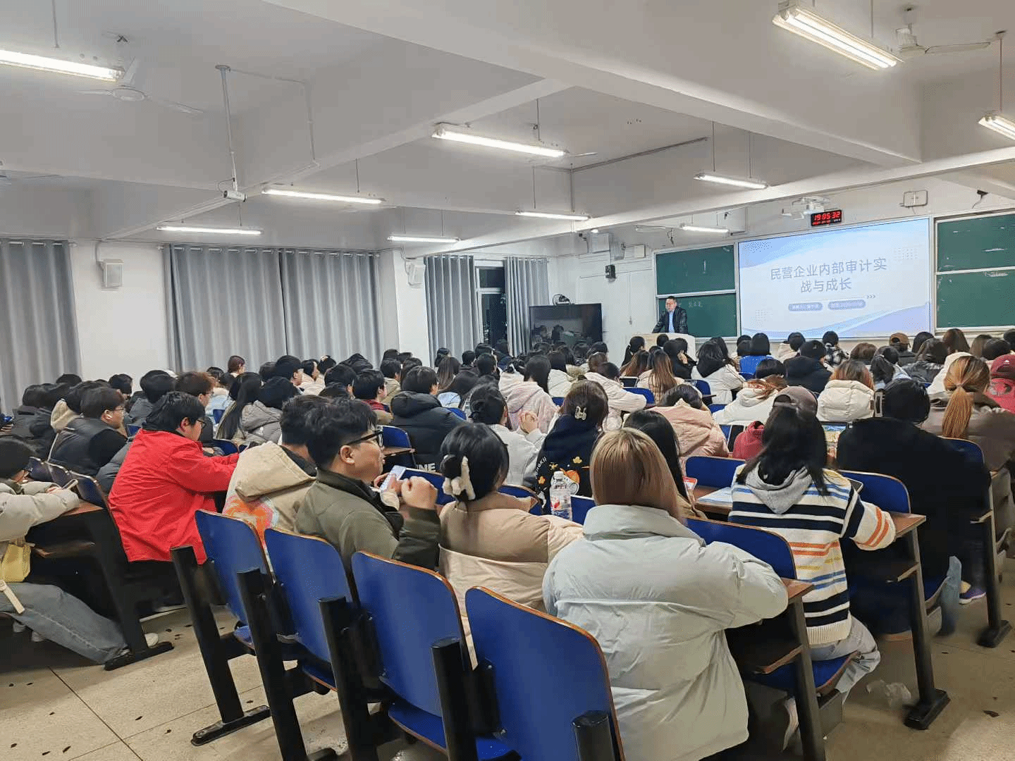 (本网讯)12月18日,会计学院“专家进课堂”系列活动第一期在第三教学楼3108教室举办。唐人神集团审计监察中心总经理梁宁波应邀为师生带来了一场题为“企业内审的实战前沿与价值创造”的专题讲座。审计系教师代表及2023级审计专业全体学生到场聆听。