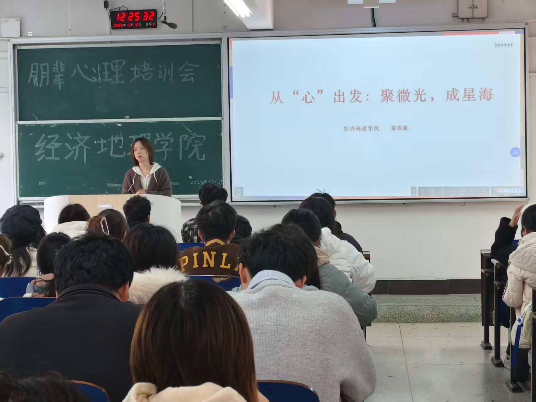 (本网讯)12月10日,经济地理学院在主校区3103教室开展心理信息员专题培训。培训由学院心理专干彭煜曦主讲,各班心理委员与寝室长参加。