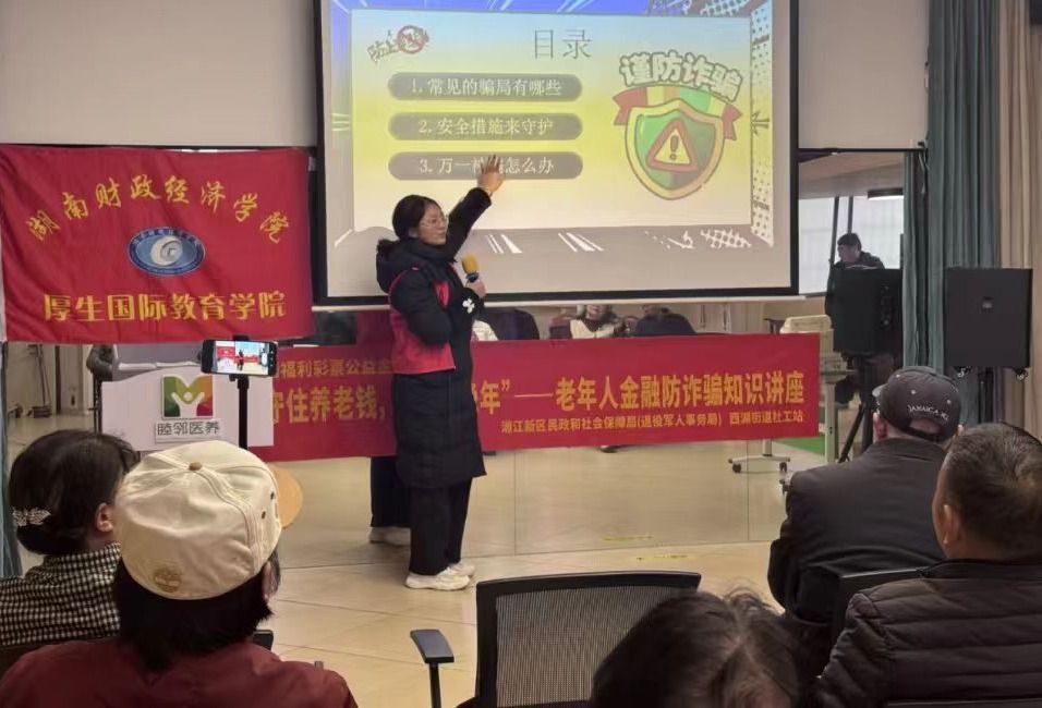 (本网讯)3月21日,厚生国际教育学院厚生志愿服务团组织12名志愿者走进睦临西湖养老中心,开展金融防诈知识宣讲活动,切实提升老年群体防范金融诈骗的意识和能力,守护好老年人的“钱袋子”。